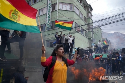 [라파스=AP/뉴시스] 4일(현지시간) 볼리비아 라파스의 코카 시장 근처에서 코카 재배 농민들의 반정부 시위가 벌어져 한 여성이 볼리비아 국기를 흔들고 경찰과 대치하고 있다. 볼리비아는 유엔개발계획의 다차원빈곤지수 조사 결과 원주민 인구비율에 비해 빈곤률이 훨씬높은 나라로 조사되었다.